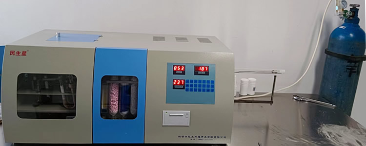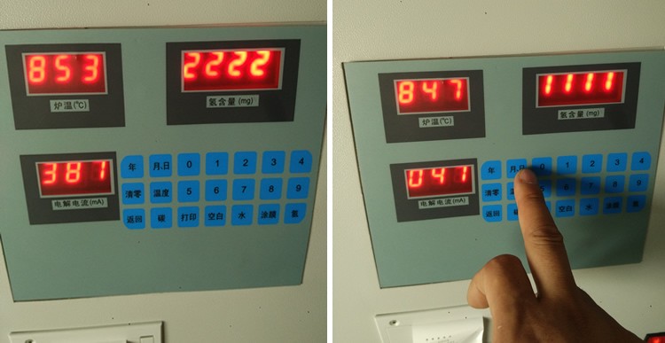 5.测氢仪在做正式样之前,先做一至二个废样,以平衡电解池状态。 6. 废样做完后,做氢空白实验,方法是:在瓷舟内加入与做样品时相当数量的三氧化钨,并按动【空白】键,九分钟后瓷舟自行拉出,按【打印】键打印出空白值,再做**个,按【打印】键打印出数值。直至相邻二个空白值相差不超过0.05mg,并取该二次的平均值作为当天的氢空白值。