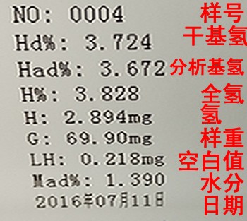 7.做正式样: a:按【年】键,输入四位数年份; b:按【月日】键,输入四位数月份和日期; c:按【水】键,输入分析煤样的水份值(%); d:按【空白】键,输入四位数的空白值,并再次按“空白”键保存,关机停电后需要重新测试并输入空白值; e:按【返回】键,输入试样重量三位数; f:打开送样口,将称好的试样放入,并关闭送样口; g:按【氢】键,即可; h:试样燃烧分析完毕后,大概14分钟,仪器自动拉出瓷舟并打印结果; i:做下一试样只需输入重量,按【氢】键即可; j:若更换煤样,需重新输入水份值,按【水】键,输入新的水份值即可。 8.待电解电流降至70mA以下后,取出试样,实验完毕后,关闭测氢仪电源。