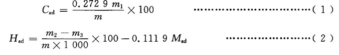 式中: Cad —空气干燥煤样中碳的质量分数,单位为百分数 (%) ; Had —空气干燥煤样中氢的质量分数,单位为百分数 (%) ; m - 空气干燥煤样质量,单位为克 (g) ; m1 —吸收二氧化碳 U 形管的增量,单位为克 (g) ; m2- 电量积分器显示的氢值,单位为毫克 (mg) ; m3- 电量积分器显示的氢空白值,单位为毫克 (mg) ; 0.2729- 将二氧化碳折算成碳的因数; 0.1119- 将水折算成氢的因数; Mad —空气干燥煤样水分(按 GB/T212 测定),单位为百分数 (%) 。 当需要测定有机碳时,按公式 (3) 计算有机碳的质量分数。